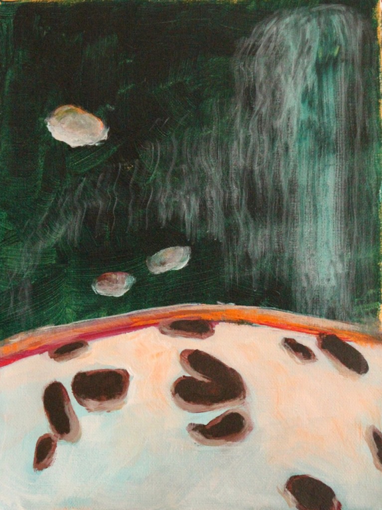 I was amazed that a teal paint chip could rustle up all these memories and associated emotions. I took the coloured bit of paper home and began to paint. An abstract based on my horse’s spots emerged after a couple of hours of painting. It is one of the more unusual paintings I’ve done over the years, but I still feel the deep emotion that first hit me when my eyes fell on the Whirlpool Blue paint sample.